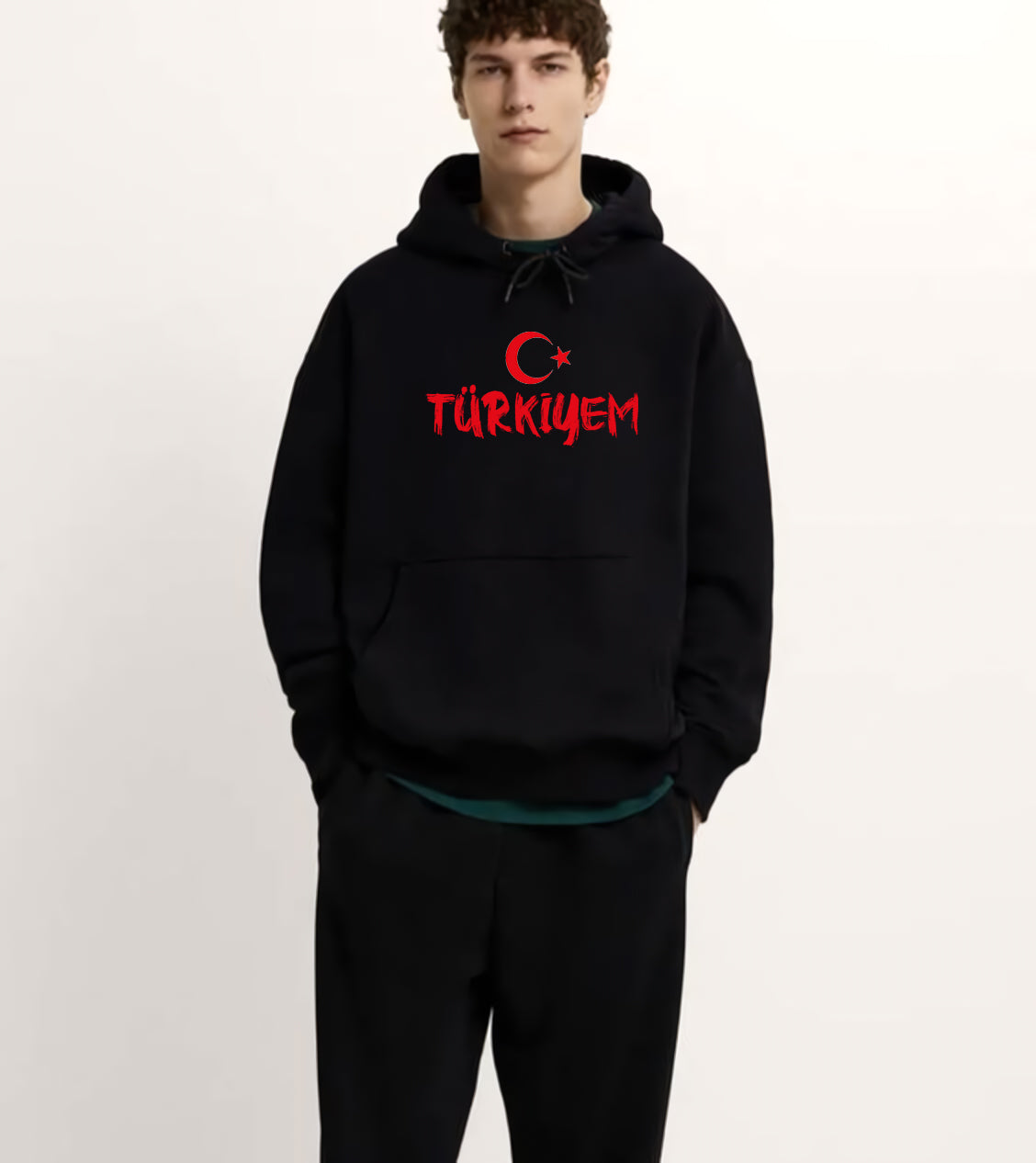 Türkiye yazı baskılı siyah 3 ip kalın kumaş unisex sweatshirt hoodie, hem şık hem de rahat bir görünüm sağlamak için tasarlanmıştır.; Bu özel tasarım sweatshirt, Türkiye'nin sembollerinden biri olan Ay yıldız ve Türkiye yazısını taşıyarak gururlu bir milli ruhu yansıtır.; Sweatshirt'ün kalın ve dayanıklı kumaşı soğuk havalarda sizi sıcak tutarken, aynı zamanda rahat hareket etmenizi sağlar.; Unisex kesimi ile her bedene uyum sağlayan bu hoodie, erkekler ve kadınlar tarafından rahatlıkla tercih edilebilir.; Ön cep detayı ile pratikliği ön planda tutarken kapüşonlu tasarımıyla da koruma ve şıklığı bir arada sunar.; Yüksek kaliteli baskısı uzun süre solmadan canlı görünümünü korurken, dayanıklılığı sayesinde uzun yıllar boyunca severek kullanabileceğiniz bir parça olacaktır.; Siyah rengiyle kolayca kombinlenebilen bu sweatshirt, günlük giyimden spor aktivitelere kadar geniş bir kullanım alanına sahiptir.; Ayrıca Türkiye sevdalısı olan yakınlarınıza harika bir hediye seçeneği olabilir.; Türk bayrağının simgesel anlamını taşıyan bu özel sweatshirt ile milli ruhunuzu ve gururunuzu her zaman üzerinizde taşıyabilirsiniz.; Hem tarzınızdan ödün vermek istemeyenler hem de Türk kültürüne bağlılık duyanlar için mükemmel bir seçim!